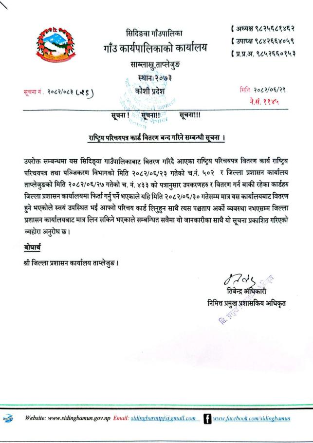 राष्ट्रिय परिचयपत्र कार्ड वितरण बन्द गरिने सम्बन्धी सूचना ।।
