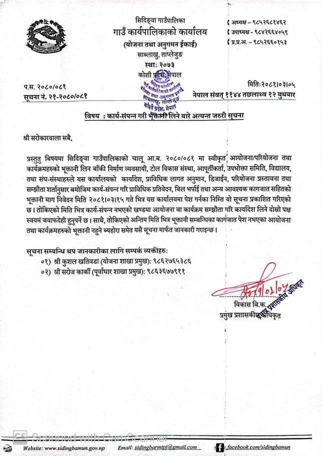 आन्तरिक आयको ठेक्का स्वीकृती र सम्झौता गर्न आउने बारेको सूचना ।