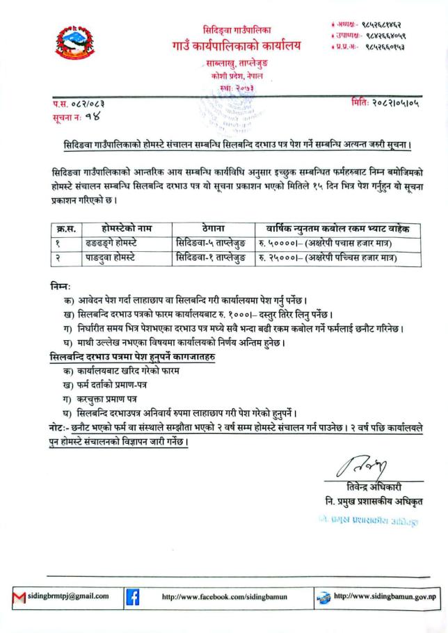 सिदिङ्वा गाउँपालिकाको होमस्टे संचालन सम्बन्धि दरभाउ पत्र पेश गर्ने सम्बन्धि जरुरी सूचना ।